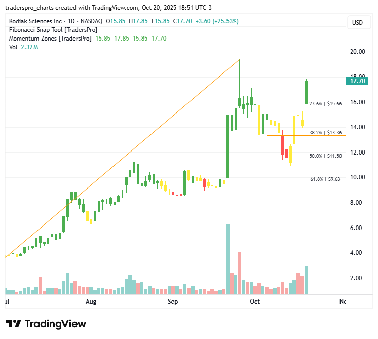 Kodiak Sciences Inc. is a clinical-stage biopharmaceutical company developing therapies for retinal diseases that cause vision loss. Its antibody biopolymer conjugate platform is designed to improve drug delivery and durability in the eye. With ongoing clinical trials and strong scientific backing, Kodiak aims to create next-generation treatments for major ophthalmic conditions. Chart